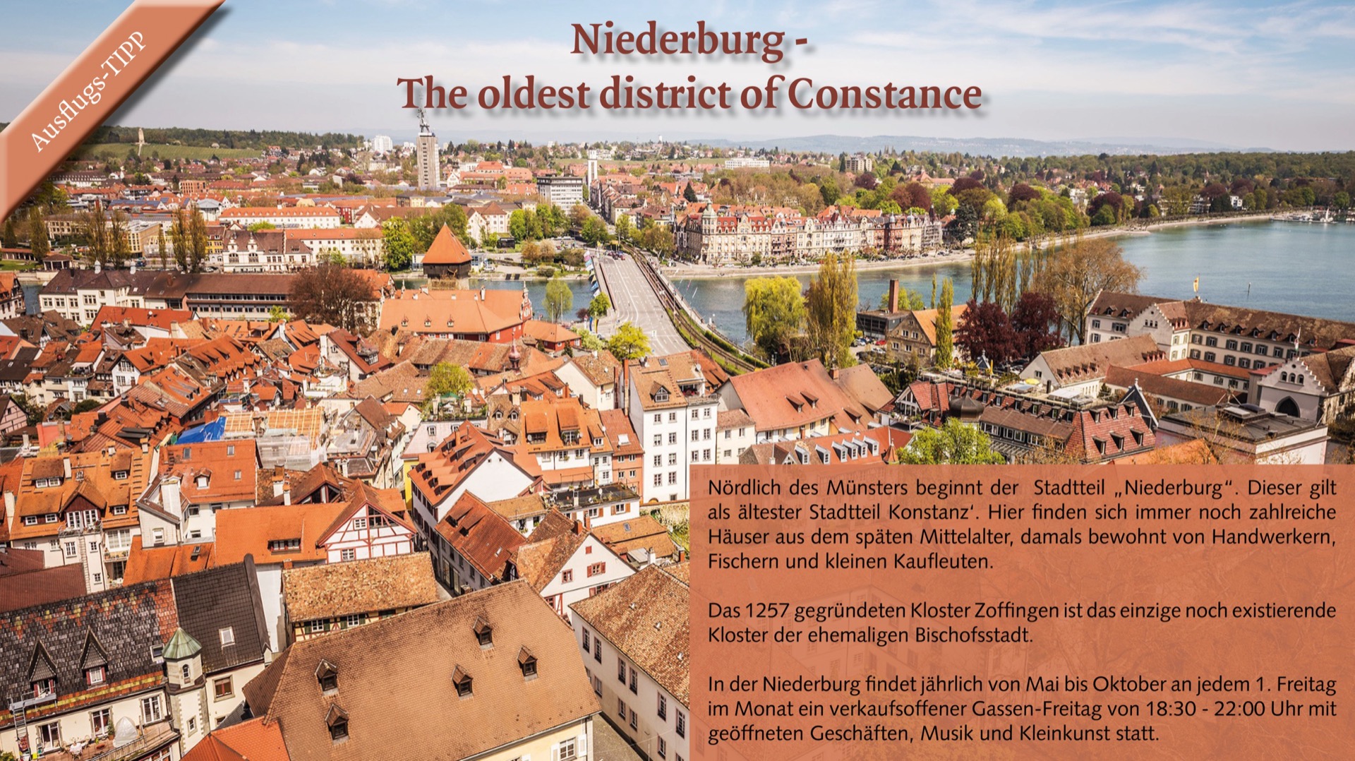 Durch die zentrale Lage im Herzen der Stadt sind die Konstanzer Sehenswürdigkeiten, der Hafen, die Seepromenade, der Bahnhof und eine Vielzahl von kulturellen Einrichtungen jederzeit und ganz bequem in wenigen Gehminuten zu erreichen.