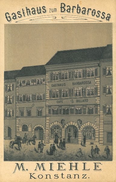 1874 kaufte Martin Miehle das Haus und betrieb es als Gasthof mit einem gut bürgerlichen Restaurant. Seine Eltern hatten in Blumenfeld den Gasthof "Kreuz" - warum er diesen nicht übernommen hat und nach Konstanz gekommen ist, um das Barbarossa zu kaufen, wissen wir leider nicht.